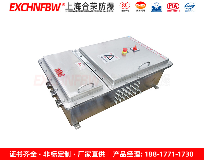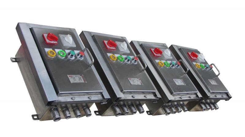 █ B、非標防爆控制箱:外殼采用鋼板焊接成型,表面噴塑。分主腔和接線腔,均采用隔爆型結構,內可選裝高分斷斷路器、交流接觸器、熱繼電器、控制按鈕、信號燈等元件,通過操作殼蓋上的手柄實現分合,動作性能可靠,并設有指示燈。進出線采用鋼管或電纜布線均可,進出線口方向及內部元件可由用戶要求而定。